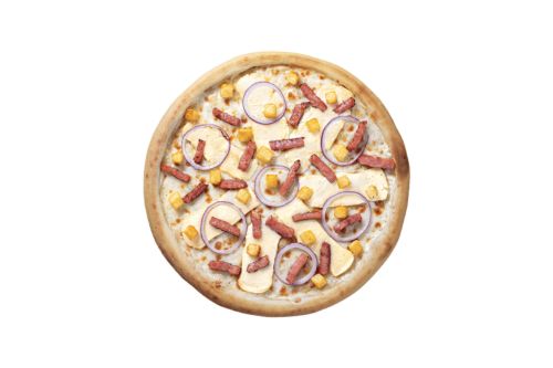 Crème fraîche, mozzarella, lardons, champignons, oignons, origan.