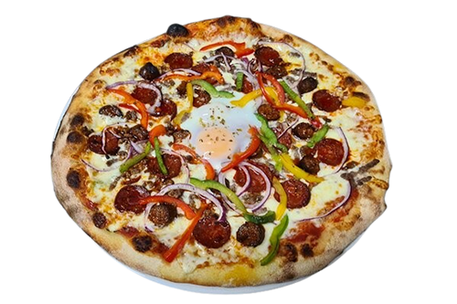 Sauce tomate, mozzarella, merguez, poivron, œuf.